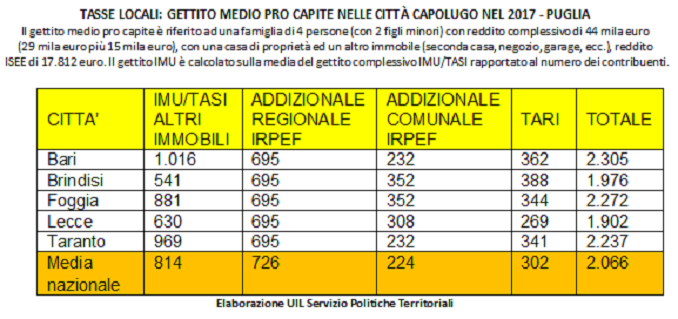 Praticamente, su tutte le voci analizzate all’interno dello studio Uil c’è un risparmio di imposta per i leccesi, ad eccezione dell’incidenza dell’Irpef comunale che raggiunge i 308 euro medi contro i 224 euro della media italiana (+37,5%). Differenze significative, a livello regionale, emergono poi sulla Tari (tassa rifiuti), per la quale a Lecce si arriva ad un esborso medio di 269 euro, dato di gran lunga inferiore rispetto a quello delle altre città capoluogo: 341 euro a Taranto, 344 euro a Foggia, 388 euro a Brindisi e 362 euro a Bari.