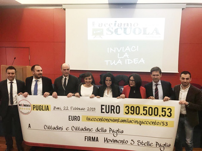 BARI- Nel caos rimborsopoli del M5s, in Puglia gli otto consiglieri regionali hanno consegnato ai pugliesi i 390.500,53 euro accantonati nei primi due anni e mezzo di mandato. Questa mattina l’assegno è stato simbolicamente consegnato nel corso di una conferenza stampa in cui i consiglieri Rosa Barone, Gianluca Bozzetti, Cristian Casili, Mario Conca, Grazia Di Bari, Marco Galante, Antonella Laricchia e Antonio Trevisi hanno illustrato gli interventi realizzati finora grazie al taglio degli stipendi dei primi 12 mesi di mandato e annunciato le nuove iniziative da finanziare.