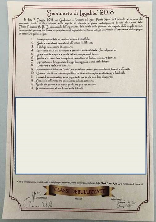 Sono questi i principi cui hanno aderito e che concretamente hanno sottoscritto gli alunni di tutte le classi, i quali, chiamati uno ad uno dai relatori ad apporre la propria firma sulla pergamena ufficiale rilasciata alla scuola e contenente l’elenco dei principi pubblicamente letti, hanno dapprima dimostrato un po’ d’emozione, per poi partecipare con sincero e vivido interesse, condividendo all’unanimità l’idea di responsabilizzarsi a vicenda, stipulando un patto con i Docenti ed i Carabinieri, all’insegna del rispetto del prossimo e della legalità, ricevendo infine l’agognata menzione d’onore di “Classe Debullizzata”.