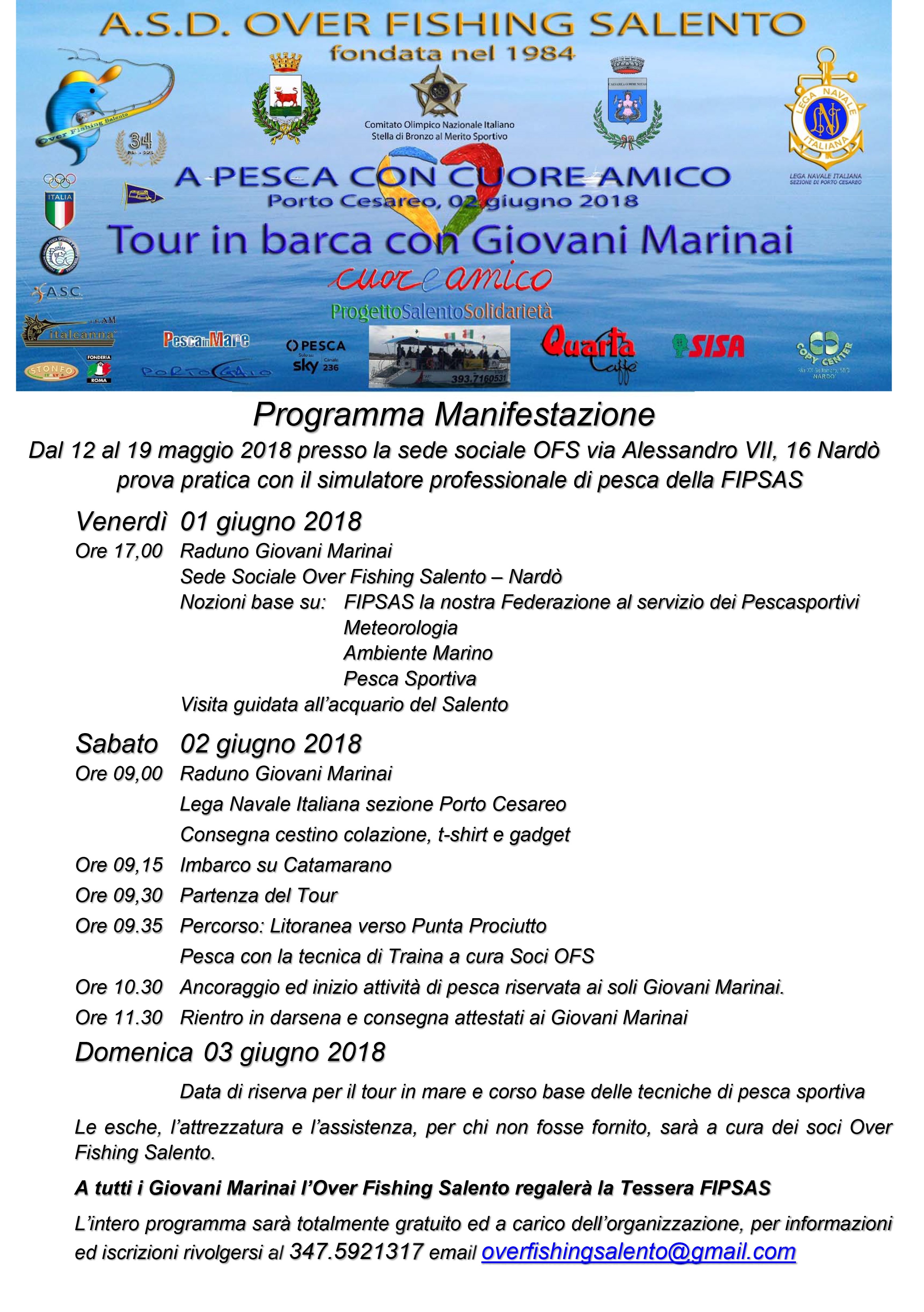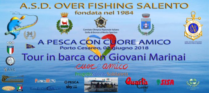 LECCE- Ancora un calendario zeppo di iniziative all’insegna della solidarietà. Over Fishing Salento, l’associazione capeggiata da Marco Pisacane, anche quest’anno ha inserito nel suo programma il tour in mare con giovani marinai dal titolo della manifestazione “A Pesca con Cuore Amico”.