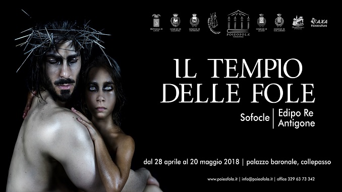 COLLEPASSO – Da domani a domenica l’ultima tranche di repliche de IL TEMPIO DELLE FOLE, prima edizione della stagione di dramma antico e teatro di letteratura, a firma della cooperativa salentina Costruzioni Teatrali “Poieofolà”, dedicata quest’anno a SOFOCLE, autore protagonista di questo debutto. Partita lo scorso 28 aprile, la rassegna ha trovato ambientazione nel Palazzo Baronale di Collepasso, con spettacoli nei week end alle ore 20.30. Riflettori accesi sulla tragedia greca, attraverso imponenti allestimenti, messinscena di forte impatto, non a caso all’aperto, poi, grande importanza alla progettazione e realizzazione di scene, costumi e trucco, e tempi scanditi da una colonna sonora originale perfettamente disegnata per amplificare le emozioni del pubblico.
