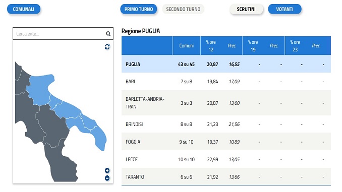 SALENTO – Alle 23 i dati sull’affluenza alle urne in 24 comuni salentini è incoraggiante: nel Leccese 69,89%. nel Brindisino, abbiamo il 65,67%, mentre Taranto chiude con il 68,42%