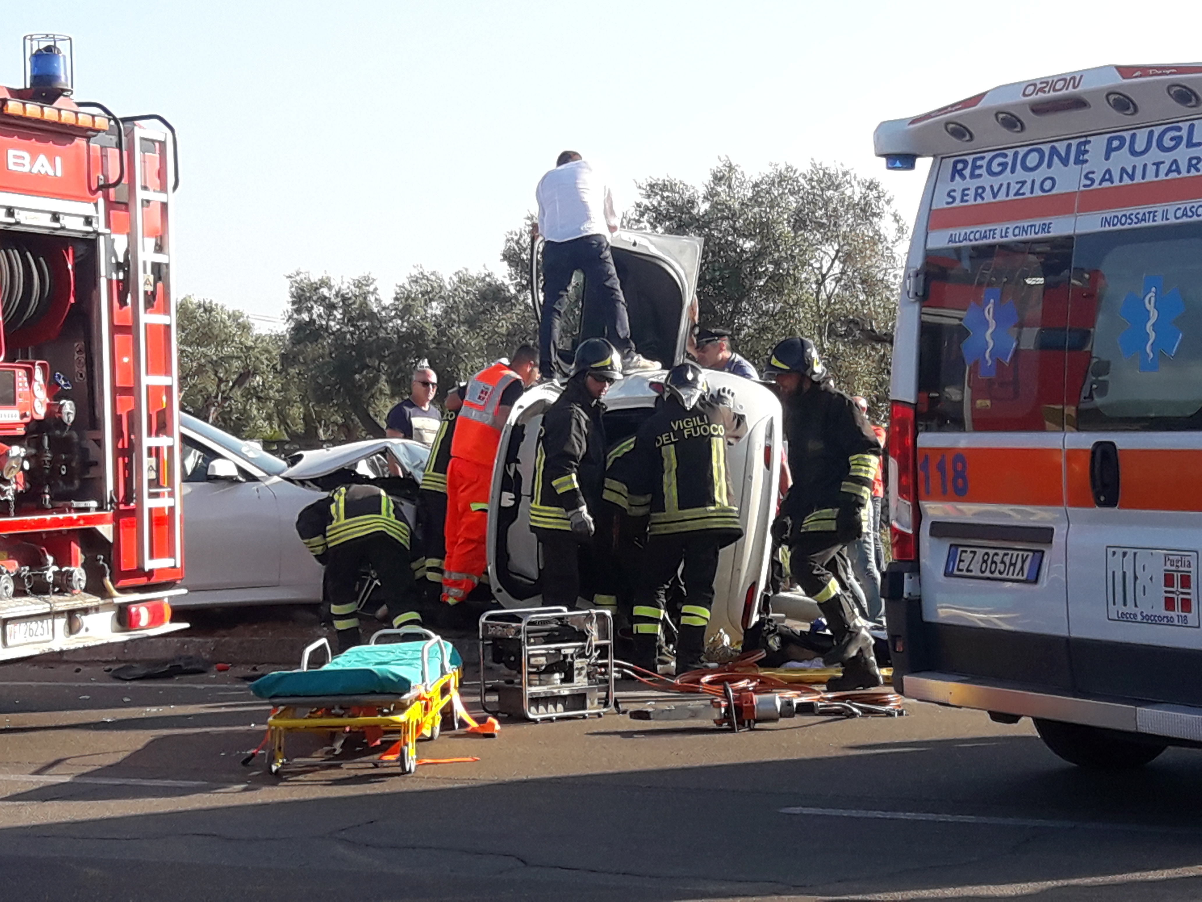 CALIMERA – Terribile schianto questo pomeriggio sulla Calimera – Caprarica. Una Fiat 500, mentre usciva dall’incrocio di Calimera è entrata in collisione con una Bmw che sopraggiungeva da Martano, lungo la provinciale. Violento l’impatto, tanto che la fiat si è capovolta. A bordo un ragazzo ed una ragazza. Per estrarre il giovane, rimasto incastrato tra le lamiere, è stato necessario l’intervento dei Vigili del Fuoco, che hanno lavorato non poco. Sul posto due ambulanze del 118 che hanno accompagnato i feriti in ospedale. Per i rilievi del caso sono intervenuti i carabinieri di Calimera,