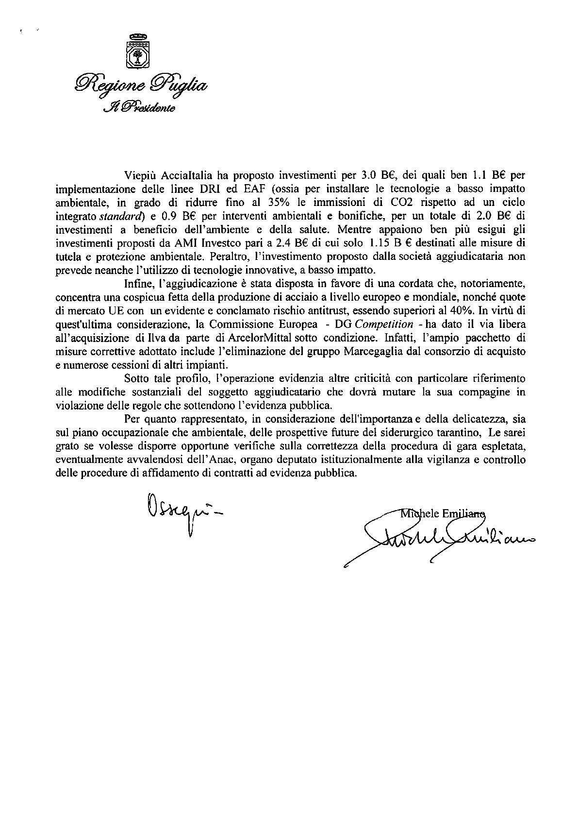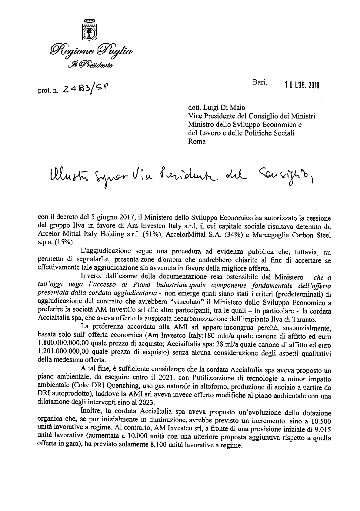 Nella lettera, inviata questo pomeriggio, Emiliano chiede a Di Maio di rivedere i passaggi della gara che il 26 maggio 2017 ha affidato alla cordata Arcelor-Mittal la proprietà dell’Ilva. Secondo il governatore ci sarebbero alcuni punti a rischio incostituzionalità. L’invito è a rivedere la gara nel suo complesso.