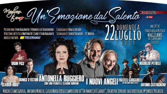 MAGLIANO- Giunto alla 14° Edizione il festival “Un’ Emozione dal Salento” organizzato dalla Ass. Magliano Ti Amo, anche quest’anno è ricco e denso di artisti, tra i quali: Antonella Ruggiero, lo storico gruppo I Nuovi Angeli, il tenore del teatro La Fenice di Venezia Dionigi D’Ostuni, la soprano italo tedesca Claudia Oddo, Antonio Castrignanò voce e tamburo de “La Notte della Taranta”, il jazzista salentino Maurizio Petrelli, la violinista praghese Marika Cvancigerova ed il vincitore del concorso musicale “Giuseppe Tricarico” Antonio Meneleo, ospite Guido Maria Ferilli compositore del celebre brano “Un Amore Così Grande”.