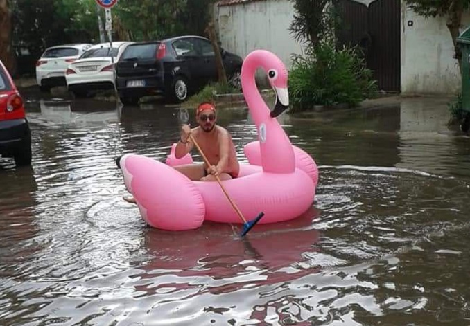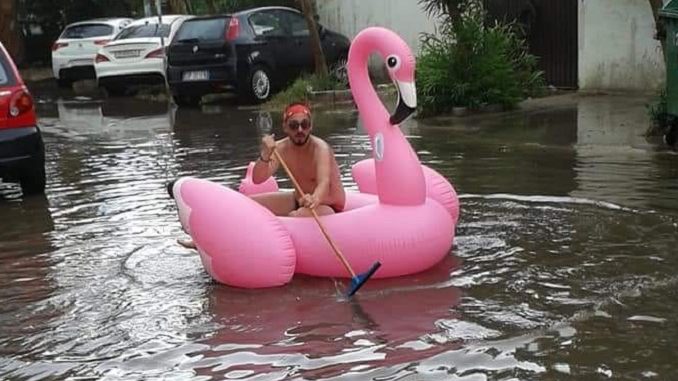 GALLIPOLI- Pioggia, temporali e strade allagate.   Ne è la prova questa foto scattata a Baia Verde, nella Città Bella, dove un ragazzo ha pensato di far fronte a questo disagio spostandosi con l’aiuto di un materassino gonfiabile, a forma di cigno, che di certo non è passato inosservato…anzi… la foto sta già facendo il giro del web.