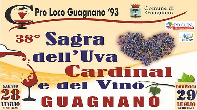 GUAGNANO – Torna a Guagnano uno degli eventi più attesi dell’estate: sabato 28 e domenica 29 luglio va in scena la 38ᵃ Sagra dell’uva Cardinal e del vino, storico evento dedicato alla nota specialità di uva locale, organizzato dalla Pro Loco Guagnano ’93 guidata dal presidente Antonio Congedo, realizzato in collaborazione con il Comune di Guagnano e rientrante nel progetto “Il suono illuminato”.