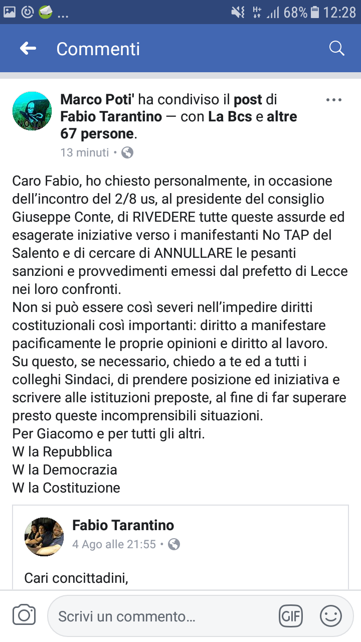 “È assurdo che in un paese come il nostro , gravato dalla piaga della disoccupazione giovanile, ad un ragazzo di 31 anni venga impedito di lavorare da un provvedimento che perseguita le sue idee politiche” scrive in un duro post su Fb il sindaco di Martano Fabio Tarantino che commenta: “Siamo veramente all’assurdo: alla multinazionale Tap è consentito fare qualsiasi cosa, al nostro concittadino non è consentito lavorare”. Il sindaco si dice pronto a difendere il suo concittadino in tutte le sedi.