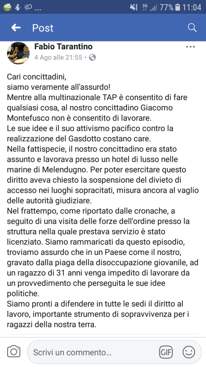 “È assurdo che in un paese come il nostro , gravato dalla piaga della disoccupazione giovanile, ad un ragazzo di 31 anni venga impedito di lavorare da un provvedimento che perseguita le sue idee politiche” scrive in un duro post su Fb il sindaco di Martano Fabio Tarantino che commenta: “Siamo veramente all’assurdo: alla multinazionale Tap è consentito fare qualsiasi cosa, al nostro concittadino non è consentito lavorare”. Il sindaco si dice pronto a difendere il suo concittadino in tutte le sedi.