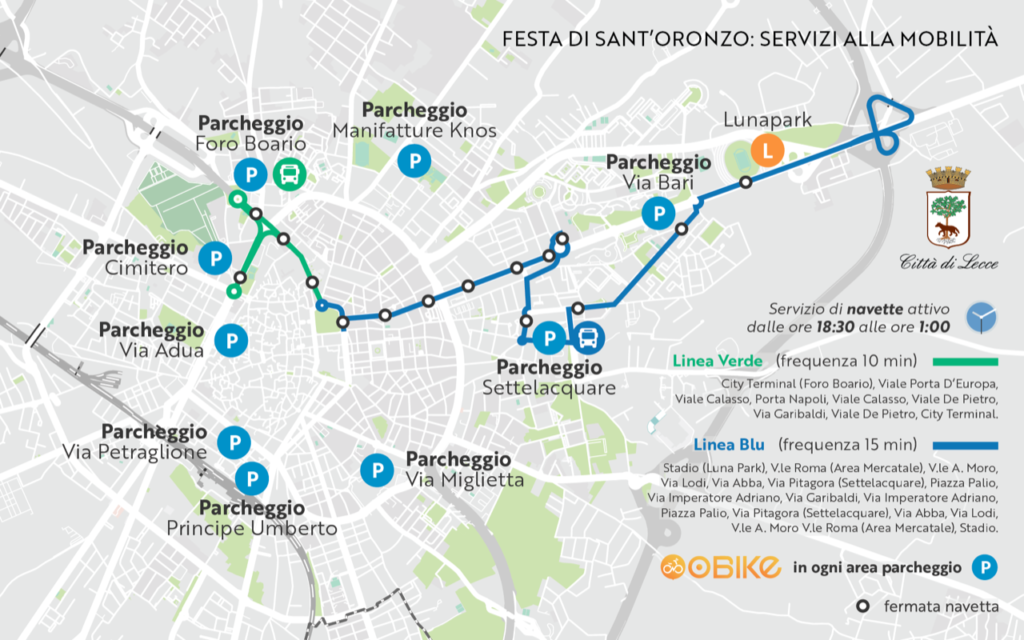 Nei giorni di festa, dal 24 al 26 agosto nei parcheggi di interscambio del Foro Boario e del Cimitero la sosta sarà gratuita. Inoltre, in ogni area parcheggio saranno disponibili le obike, servizio di bike sharing del Comune di Lecce.