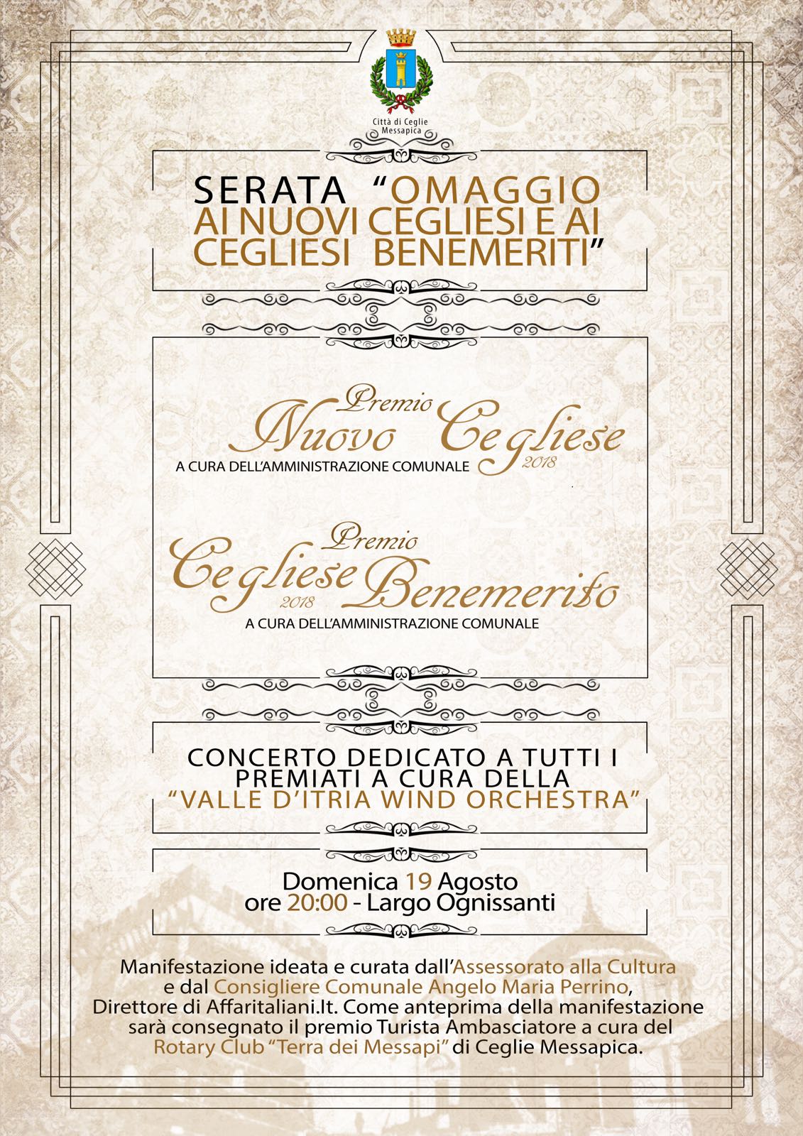 Durante la serata a nome della città di Ceglie Messapica sarà assegnato il premio “Nuovo Cegliese” 2018 al famoso imprenditore del lusso Kean Etro (stilista e titolare della omonima casa di moda), a Cesare Fiorio (già direttore sportivo della Ferrari), a Donatella Caprioglio (psicologa e scrittrice, docente alla Sorbona) a Paolo Giordano (scrittore e fisico) e Marco Klinger (medico chirurgo) e a sua moglie Ita (stilista e designer). Sarà anche assegnato il premio “Cegliese Benemerito” 2018 a emigrati capaci di affermarsi lontano da casa, al Nord o all’estero, come Luciano Fedele (imprenditore dell’hotellerie a Milano e nel nord Italia, alla vigilia della sua quotazione in borsa) e ad Andrea Chirulli (imprenditore delle infrastrutture viarie e dei lavori pubblici in Italia e all’estero).
