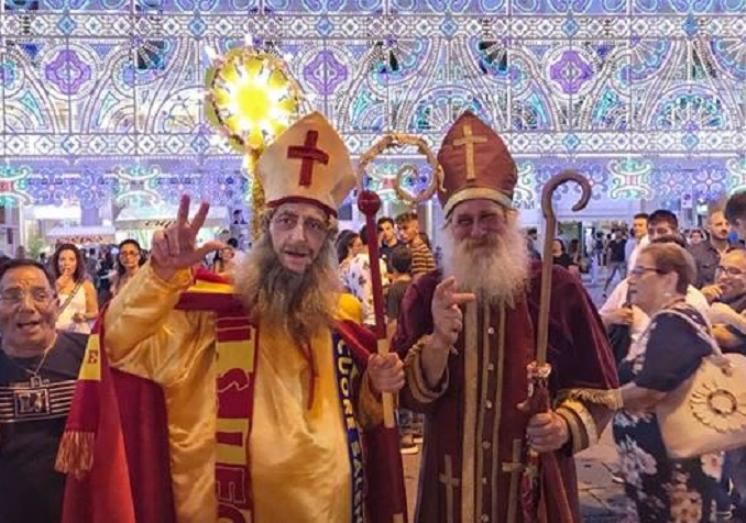 LECCE- L’ironia dei Party Zoo Salento si veste in festa e scende nel cuore della città con un incontro storico, quello tra il patrono leccese in giallorosso e Sant’Oronzo, che circondati dalla folla intonano insieme una delle canzonei più famose del folk popolare leccese.