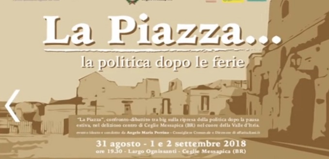 CEGLIE MESSAPICA- Ceglie si prepara ad una tre giorni di dibattiti e confronti con alcuni tra i principali protagonisti della politica nazionale. Si tratta dell’evento “La Piazza… la politica dopo le ferie” organizzato e moderato dal direttore di Affaritaliani.it Angelo Maria Perrino.