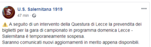SALERNO – Con un comunicato stampa e rispettivo post su Facebook l’US Salernitana, prossimo avversario del Lecce in campionato, nella gara che si giocherà domenica sera alle ore 21 al Via del Mare ha fatto sapere che è stata sospesa la vendita dei biglietti ai tifosi campani.