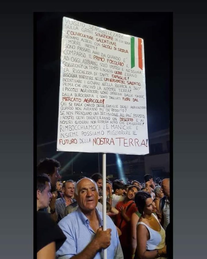 Un grido di parole scritte,  tra migliaia di voci in festa, in una protesta autonoma e solitaria, senza nessuna forma di organizzazione. Eppure ad essere minacciati non sono solo gli ulivi ma anche l’economia e l’identità di un territorio che non è solo musica e festa.