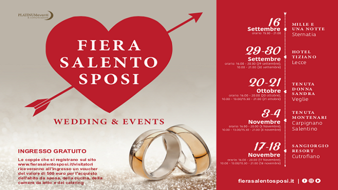 Fiera Salento Sposi, organizzata dall’Agenzia Platinum eventi di Giovanni Conversano e Giada Pezzaioli, è al suo quinto anno. Offre ai visitatori un percorso emozionale tra gli stand delle aziende salentine leader nel settore del “wedding”.