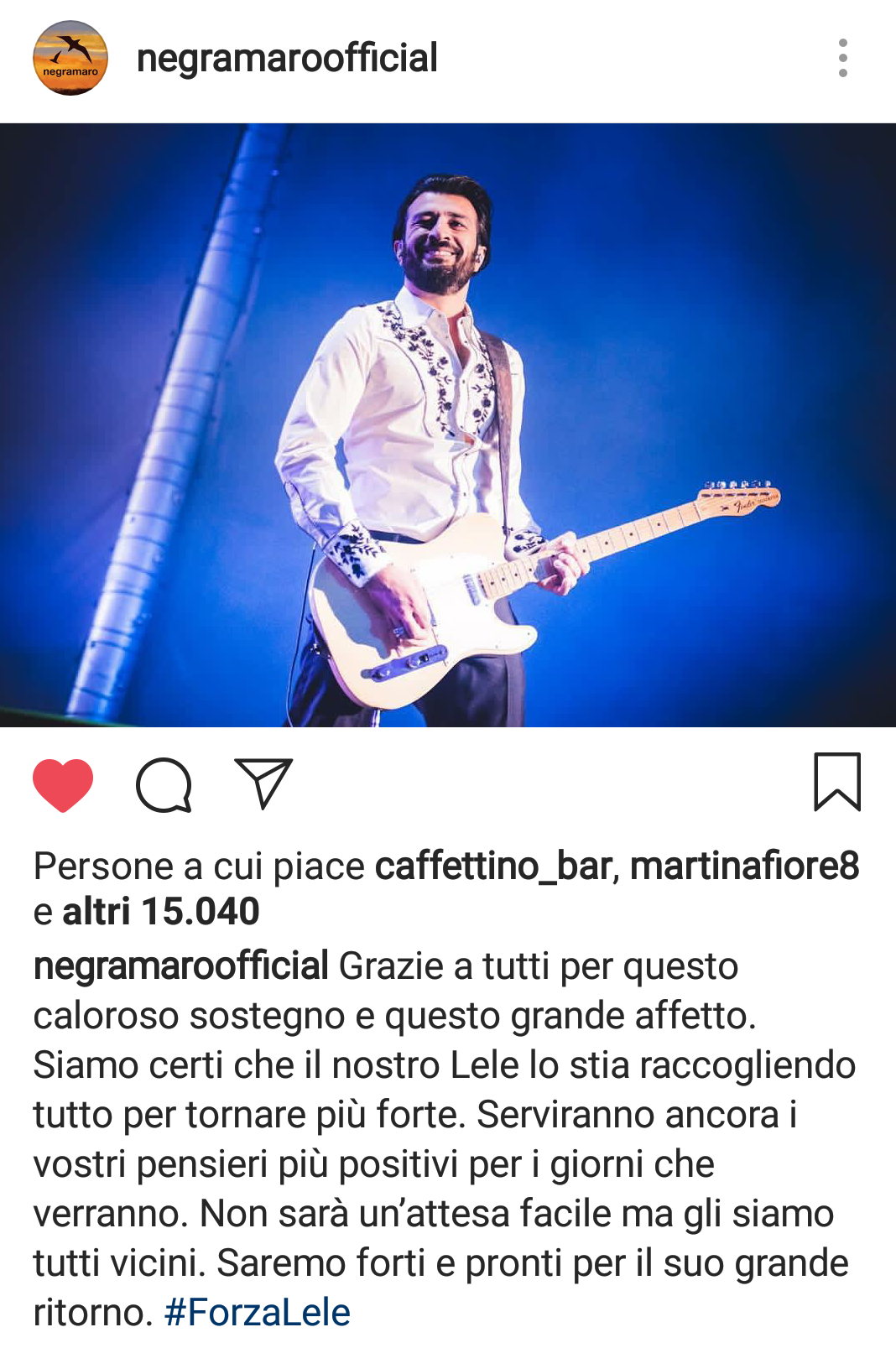 “Grazie a tutti per questo caloroso sostegno e questo grande affetto -scrivono i Negramaro su Instagram, sempre copn l’ashtag #ForzaLele- Siamo certi che il nostro Lele lo stia raccogliendo tutto per tornare più forte. Serviranno ancora i vostri pensieri più positivi per i giorni che verranno. Non sarà un’attesa facile ma gli siamo tutti vicini. Saremo forti e pronti per il suo grande ritorno”.