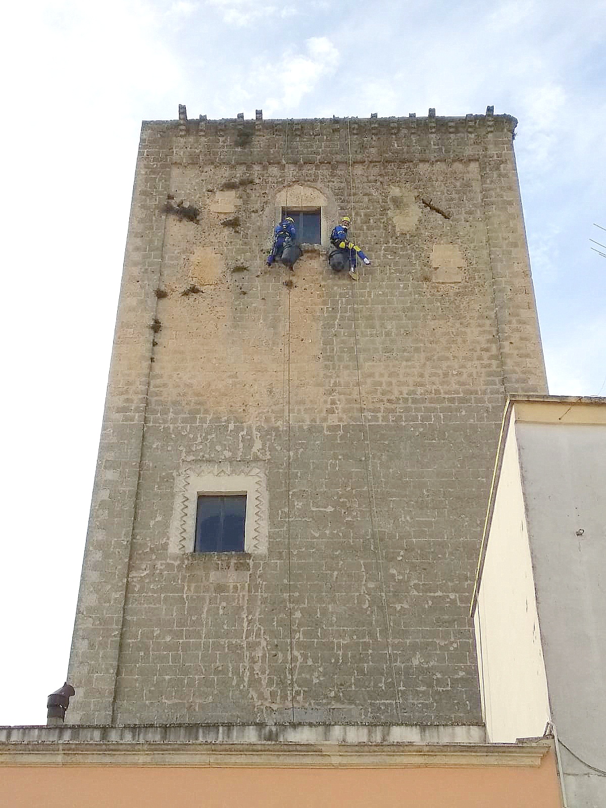 LEVERANO- Al via questa mattina a Leverano ad un intervento di pulizia straordinario della Torre Federiciana dalle numerose erbe infestanti che interessano i suoi 4 lati. L’intervento è stato seguito con modalità innovative ed efficaci. Anzichè procedere al montaggio di costose impalcature, i tecnici specializzati dell’azienda incaricata si sono calati dall’alto della Torre, in sicurezza, con apposite imbracature, provvedendo ai lavori di pulizia nel rispetto delle indicazioni e prescrizioni della Soprintendenza, alla quale è stato preventivamente sottoposto il progetto.