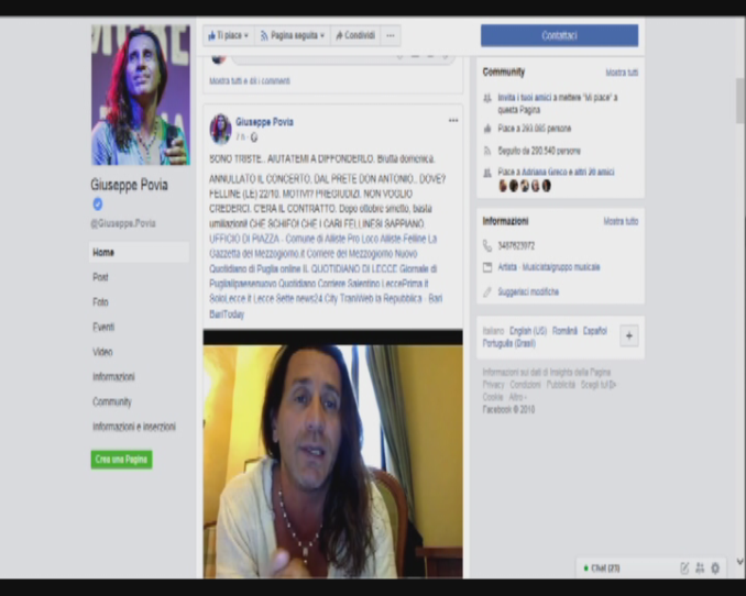Povia addita, come responsabile il parroco del paese. Una storia che si ripete : il 20 aprile scorso l’artista avrebbe dovuto esibirsi sul palco del Paisiello a Lecce, ma anche in questo caso il concerto fu annullato tra le polemiche. Anche questa volta lui parlò di pregiudizi, poi smentiti sia dal Comune che dall’associazione per cui la serata era stata organizzata. Il cantante fu poi a Lecce, in un concerto dal grande successo, voluto da Paolo Pagliaro nelle Officine Cantelmo. Il 22 aprile si esibì gratuitamente in una serata dedicata all’associazione Cuore amico. Tanti i commenti seguiti al suo post, tanti i fellinesi che hanno voluto lasciare la propria opinione, a difesa del parroco che non c’entra nulla, o spalleggiando il cantante, che ancora una volta si è trovato costretto ad annullare, nel Salento, una data delle sue ebizioni.