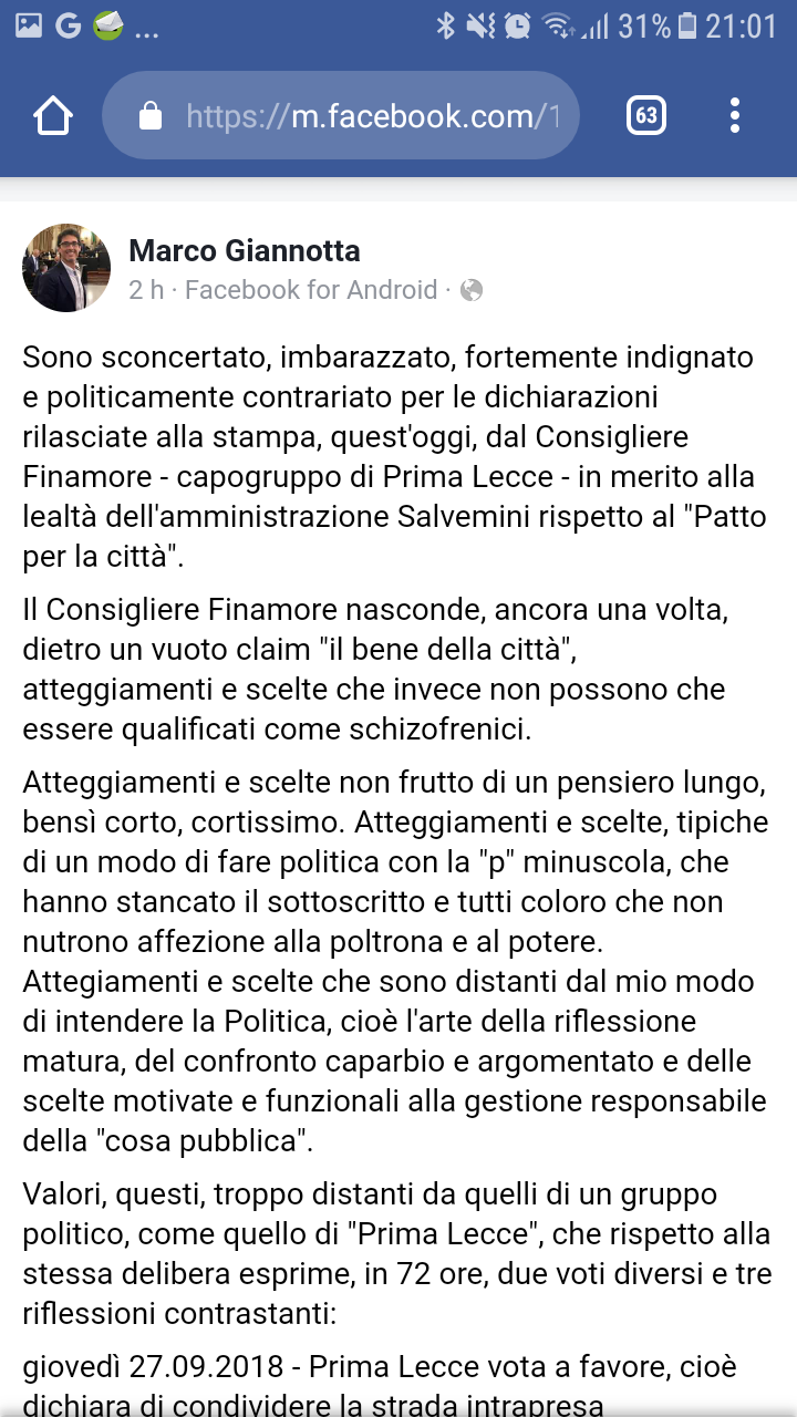 Nelle stesse ore Giannotta scrive: “Sono sconcertato, imbarazzato, fortemente indignato e politicamente contrariato per le dichiarazioni rilasciate alla stampa, quest’oggi, dal Consigliere Finamore. Il Consigliere nasconde, ancora una volta, dietro un vuoto claim “il bene della città”, atteggiamenti e scelte che invece non possono che essere qualificati come schizofrenici. Atteggiamenti e scelte non frutto di un pensiero lungo, bensì corto, cortissimo. Atteggiamenti e scelte, tipiche di un modo di fare politica con la “p” minuscola.