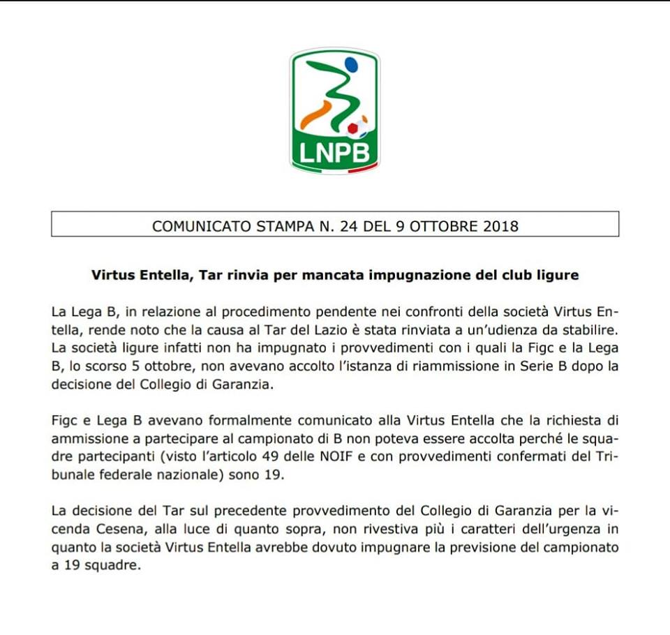 Figc e Lega B avevano formalmente comunicato alla Virtus Entella che la richiesta di ammissione a partecipare al campionato di B non poteva essere accolta perché le squadre partecipanti (visto l’articolo 49 delle NOIF e con provvedimenti confermati del Tribunale federale nazionale) sono 19.