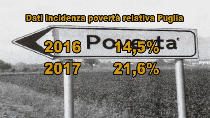 BARI- In Puglia la povertà galoppa più che altrove. Più che nelle altre regioni del Sud. In un anno, si è registrato il maggiore incremento di povertà relativa, pur restando al di sotto dell’incidenza del Mezzogiorno. Significa, in sostanza, che tra il 2016 e il 2017 si è avuto un peggioramento di 7 punti percentuali, due in più rispetto allo sbalzo in negativo dell’intero Mezzogiorno.