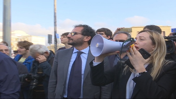 LECCE – Ad attenderla c’era un gruppo di manifestanti, circa 10, con tanto di striscione al seguito: “Razzismo ed esclusione -c’è scritto- sono la vostra sicurezza”. Lei, Giorgia Meloni, leader di Fratelli d’Italia, arrivata in stazione, a Lecce, per proporre di militarizzarla (sulla scorta dell’emendamento proposto dal suo partito ma bocciato in Parlamento) ha dedicato a loro baci e selfie, bollandoli come “quattro scemi, figli di papà”.