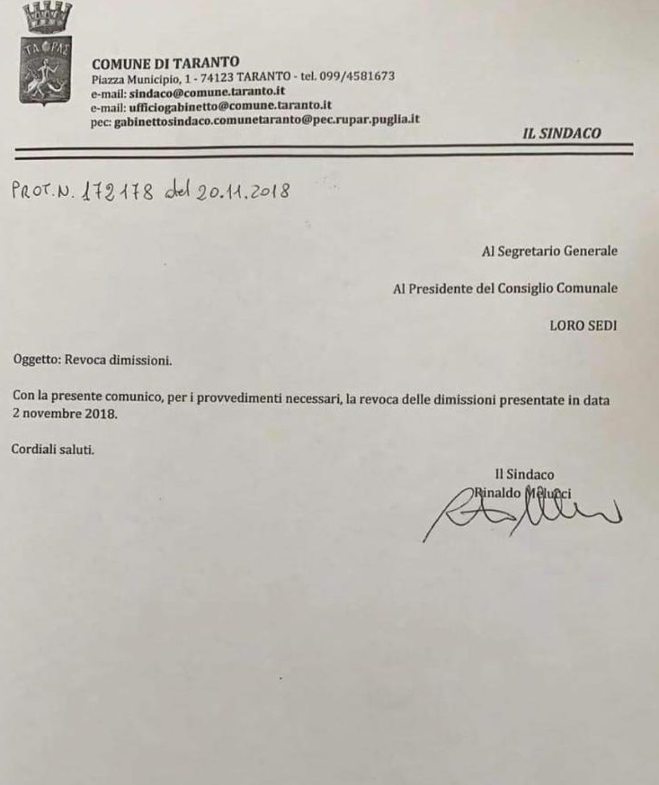 TARANTO – Il sindaco Rinaldo Melucci ha ritirato le dimissioni. In 17, primo cittadino compreso, hanno firmato un documento politico-programmatico per cercare di ricompattare la coalizione. La maggioranza dovrebbe dunque tenere. Melucci aveva presentato le dimissioni l’1 novembre, all’idomani delle elezioni provinciali, proprio per problemi all’interno della sua maggioranza di centrosinistra.