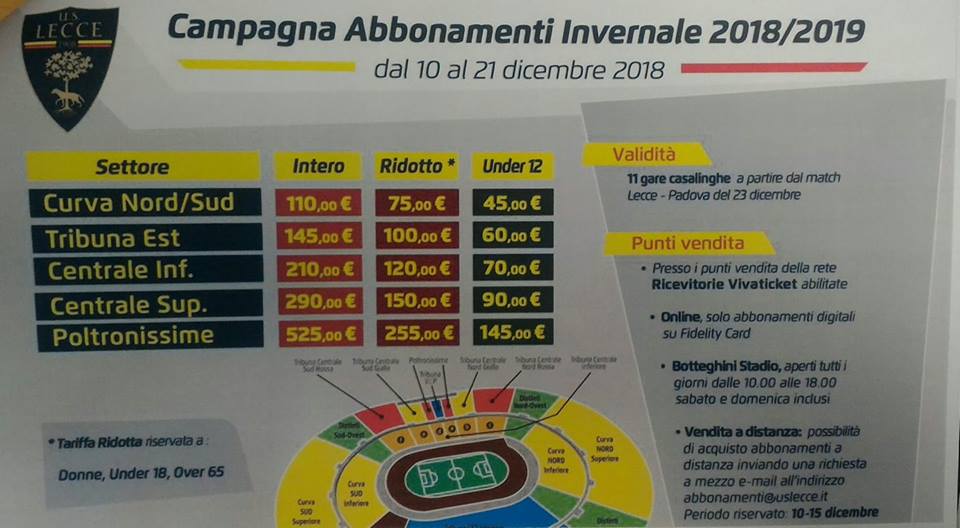 “Lo slogan riprendendo quello estivo è le fede non va mai in vacanza nemmeno a Natale. I prezzi, prendendo come esempio la Curva, saranno di 10 euro a gara abbonandosi, è inclusa anche la partita col Padova in casa e quindi saranno 11 e sarà 100 euro, e chi si abbonerà adesso nella prossima stagione sarà considerato vecchio abbonato. Ovviamente chi ha fatto abbonamento in estate paga 7,50 a partita, ma non potevamo dare le stesse agevolazioni, chi si è abbonato in estate meritava il giusto rispetto. A tutti gli abbonati che presenteranno un amico regaleremo una sciarpa”.