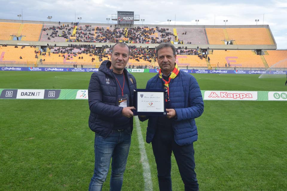 Prima del fischio d’inizio il Presidente di Cuore Amico, Paolo Pagliaro, consegna al Presidente del Lecce, Saverio Sticchi Damiani, una targa, è un riconoscimento in segno di ringraziamento per la vicinanza e la sensibiltà che la società di Via Col. Costadura ha sempre dimostrato verso l’associazione.