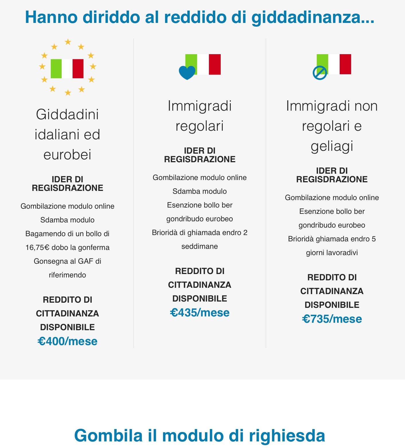 I ludici napoletani, sul sito www.redditodicittadinanza2018.it, pensano anche agli extracomunitari con un’apposita “sezione in lingua”, in cui fanno il verso alla parlata africana (?), con la pagina a loro dedicata e titolata: Reddido di Giddadinanza 2018/2019 con la descrizione del progetto “è un gondribudo ghe lo Sdado garandisce alle famiglie in diffigoldà ghe non bergebisgono reddido o con reddidi moldo bassi…” così come aprendo il modulo le tradizionali sezioni sono accuratamente descritte con nome, gognome, nado a… e godige fisgale…