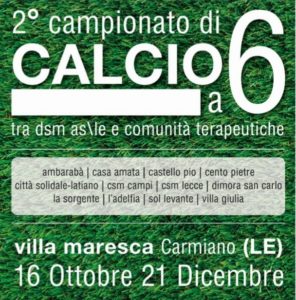 Sul campo del centro sportivo Villa Maresca di Carmiano è terminato il 2° Campionato di Calcio, organizzato dal Dipartimento di Salute Mentale dell’ASL di Lecce, in collaborazione con l’ACSI ed ha visto impegnate le Squadre dei Dipartimenti del CSM di Campi Salentina e di Lecce e le Comunità Terapeutiche del privato sociale dal 16 ottobre al 21 dicembre, ed ha visto partecipare le squadre Ambarabà’, Casa Amata, Cento Pietre, Città Solidale Latiano, Dimora San Carlo, L’Adelfia Alessano, San Giovanni Castello Pio, Sol Levante, Sorgente, Villa Giulia.