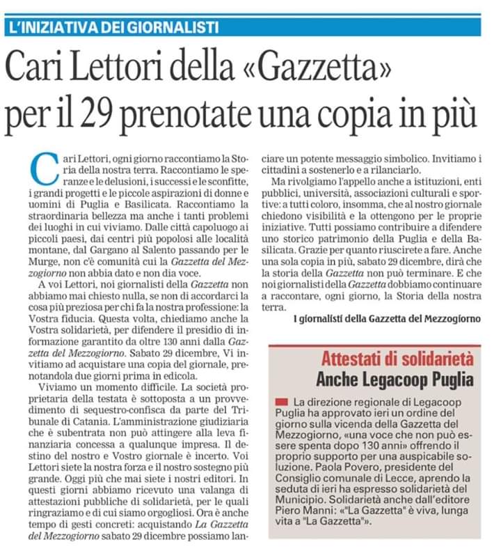 LECCE – “Cari lettori della Gazzetta, per il 29 dicembre prenotate una copia in più“. Da queste pagine, che informano da 130 anni i cittadini di Puglia e Basilicata, chi è con voi ogni giorno, ora vi rivolge un appello. Sono i giornalisti della Gazzetta del Mezzogiorno. In difficoltà, anzi in pericolo, da quando è scattato il provvedimento di confisca dei beni dell’editore catanese Ciancio Sanfilippo, sotto inchiesta per presunto concorso esterno in associazione mafiosa. Dopo aver scritto al Presidente della Repubblica, chiamano ora il lettore in prima persona a essere parte attiva nell’esprimere solidarietà: chiedono, per il 29 dicembre, di prenotare in edicola una copia in più del giornale.