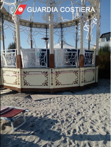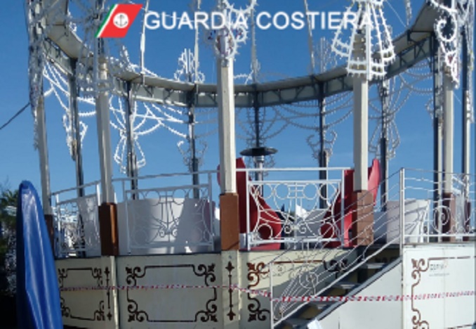 PORTO CESAREO- Amara sorpresa per coloro che volevano correre a Le Dune per scattare qualche selfie o divertirsi dinanzi alla cassa armonica, posizionata accanto all’albero di Natale e la slitta, in occasione di queste festività. I militari della Guardia Costiera di Gallipoli e di Torre Cesarea,hanno infatti fatto scattare i sigilli.   Stando a quanto pervenuto,  l’installazione, alta circa 11 metri, larga 8,  era stata posizionata in carenza dei titoli autorizzativi previsti dalla vigente normativa. Su parere concorde del magistrato di turno della Procura della Repubblica di Lecce,  i militari hanno così sequestrato  la cassa armonica e deferivano il titolare dello stabilimento all’ Autorità Giudiziaria.