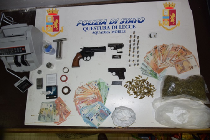 In casa sua gli agenti della squadra mobile di Lecce, durante una perquisizione mirata, hanno rinvenuto tre pistole perfettamente funzionanti, più di 100 cartucce di vario calibro e poi sostanza stupefacente di vario tipo: più di 150 grammi di marijuana, circa 4 grammi di cocaina, 20 grammi di hashish e altra sostanza da taglio.