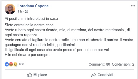 L’assessore regionale Loredana Capone e la sua famiglia sono stati vittima di un furto. I ladri sono entrati nella sua abitazione e l’hanno svaligiata portando via argenteria e preziosi. La famiglia si è accorta del furto sabato sera, quando poi ha sporto denuncia alla Polizia. E mentre le forze dell’ordine stanno indagando cercando di risalire agli autori lo stesso assessore ha scritto un post su Fb. Parole di rabbia e amarezza rivolte direttamente agli autori del furto, a quelli che definisce “i pusillanimi intrufolatisi in casa”: “Siete entrati nella nostra casa. Avete rubato ogni nostro ricordo, mio, di massimo, del nostro matrimonio, di ogni nostra ragazza. Avete cercato di tagliare le nostre radici -continua- ma non ci ruberete il sorriso. Il vostro guadagno non vi renderà felici, pusillanimi. Il significato di ogni cosa che avete preso è per noi, non per voi. E in noi rimarrà per sempre”.
