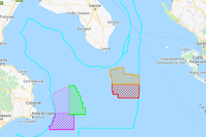 Eccoli gli specchi d’acqua che saranno perlustrati: in fucsia, più vicino alle coste calabresi, ci sono i 729,50 km2 dell’istanza d87; in arancione i 744,60 km2 della d89; in rosso i 749,1 km2 della d90. Questi ultimi sono vicinissimi a Leuca, subito dopo il limite di 12 miglia dalla costa tutelato per legge.