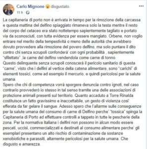 “La Capitaneria di porto non è arrivata in tempo per la rimozione della carcassa -scrive nel post su facebook- e questa mattina del delfino spiaggiato rimaneva solo la testa mentre il resto del corpo del cetaceo era stato nottetempo sapientemente tagliato e portato via da sconosciuti, con tutta evidenza per essere mangiato, vendendola come carne di tonno. Adesso spero che l’allarme sulle conseguenze per la salute umana del consumo di carne di Delfino perchè “tossica” spinga la Capitaneria di Porto ad effettuare controlli a tappeto in tutte le pescherie della zona. Per la normativa italiana i delfini non possono in alcun modo essere pescati, uccisi, commercializzati e destinati al consumo alimentare perche’ gli esemplari presentano un alto rischio di contaminazione da sostanze xenobiotiche e parassiti, altamente pericolosi per la salute umana. Che disgusto e amarezza”.