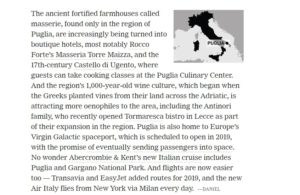 Ma questo è tutto un altro capitolo: per quanto riguarda la bellezza dei paesaggi o dell’architettura nostrana, e la bontà dei prodotti della terra, il N.Y. Times non ha dubbi nel descrivere “Le antiche masserie fortificate sempre più spesso trasformate in boutique hotel. Due le strutture segnalate: la Masseria Torre Maizza, che si trova in una frazione di Fasano, e il Castello di Ugento”. Parla della famiglia Antinori, che ha aperto il bistrot Tormaresca a Lecce, oltre che della “cultura vinicola millenaria della regione, iniziata quando i greci, attraversando l’Adriatico, piantarono le viti”. Arrivare in aereo è ora più facile, viene spiegato, con le nuove rotte istituite e già disponibili. Non solo: si fa cenno anche al progetto di “spazioporto” di Grottaglie, da dove si potrà in futuro partire per i viaggi nello spazio di Virgin Galactic. Dunque, siamo nella top 20, sia che si guardi al mare, che agli antichi castelli, che alla buona tavola o alla volta celeste.