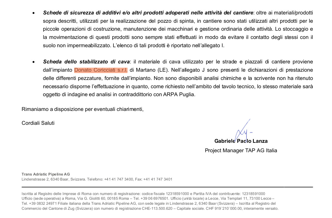 L’azienda Donato Coricciati, con una nota, ha dichiarato di “non ha fornito lo stabilizzato di cava per il cantiere di San Basilio risultato ‘contaminato da cromo esavalente”. “Gli attivisti – ha aggiunto – hanno affisso manifesti accusatori sui cancelli della nostra azienda senza verificare la provenienza dello stabilizzato. Hanno così prodotto un grave danno di immagine all’azienda Donato Coricciati e ai suoi dipendenti. Danno che sarà valutato nelle sedi opportune”. Qualcosa non torna: è da documenti della stessa Tap (vedi foto a sinistra) che si evince che il materiale proviene da Coricciati.