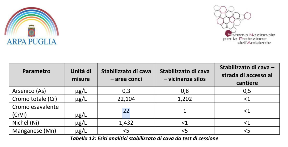 L’azienda ha fornito a Tap, per la costruzione del gasdotto, lo stabilizzato di cava per il cantiere di San Basilio. Stando alle analisi effettuate da Arpa Puglia, non solo il cemento usato per la costruzione del pozzo di spinta ma anche quel materiale presente nell’area conci è risultato contaminato da Cromo esavalente con valore di 22 microgrammi/litro. Lo stesso materiale nelle vicinanze silos e nella strada di accesso al cantiere ha valori pari o inferiori ad 1, stando sempre agli esiti del test di cessione effettuato da Arpa.
