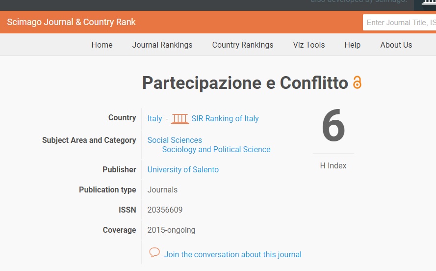 LECCE- PARTECIPAZIONE E CONFLITTO, fondata e diretta da Fabio de Nardis, Presidente del Corso di Laurea in Sociologia presso la Università del Salento, e pubblicata dalla Salento University Publishing è diventata la più importante rivista italiana di sociologia e scienza politica. A testimoniarlo è la Scimago Journal & Country Rank, la principale agenzia internazionale di rating che valuta le prestazioni di riviste scientifiche e collane editoriali a livello mondiale. Nel nuovo ranking reso, PARTECIPAZIONE E CONFLITTO risulta infatti la prima, superando nettamente tutte le riviste storiche di settore.