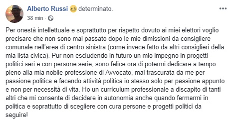 “Per onestà intellettuale e soprattutto per rispetto dovuto ai miei elettori voglio precisare che non sono mai passato dopo le mie dimissioni da consigliere comunale nell’area di centro sinistra (come invece fatto da altri consiglieri della mia lista civica).” Esordisce così sottolineando il salto della quaglia di altri candidati nella lista Grande Lecce nel Marzo 2017. “Pur non escludendo in futuro un mio impegno in progetti politici seri e con persone serie, sono felice ora di potermi dedicare a tempo pieno alla mia nobile professione di Avvocato, mai trascurata da me per passione politica e facendo attività politica io stesso solo per passione appunto e non per necessità di vita. Ho un curriculum professionale a discapito di tanti altri che mi consente di decidere in autonomia anche quando fermarmi in politica e soprattutto di scegliere con cura persone e progetti politici da seguire!”. Una smentita e contemporaneo annuncio, quello di Alberto Russi, pur non tralasciando le motivazioni che lo hanno spinto, ad ora, ad abbandonare l’impegno in prima persona. Nel ribadire infatti la possibilità di un ritorno sottolinea la necessità di doverlo fare con persone e progetti politici seri ribadendo quindi la sua delusione per progetti e colleghi poco seri con cui non poteva continuare a camminare in occasione della campagna elettorale che porterà Lecce a nuove elezioni comunali.