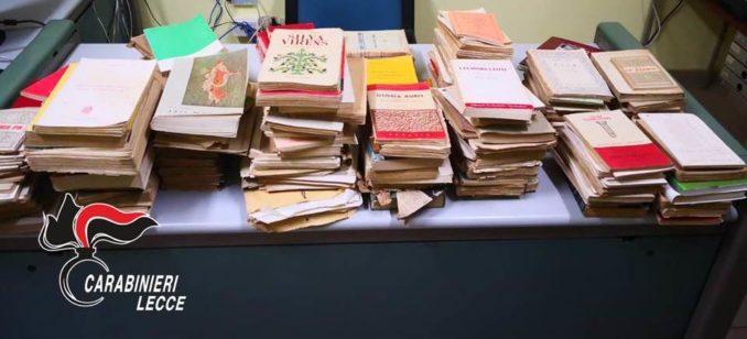 TAVIANO- Aveva rubato 200 libri dalla casa disabitata di un anziano residente all’estero: i carabinieri hanno scoperto e denunciato il responsabile. È successo a Taviano, dove i militari hanno identificato il ladro in un 35enne del posto, denunciato a piede libero per furto in abitazione. Recuperati i libri di letteratura antica e filosofia, che saranno restituiti al proprietario.