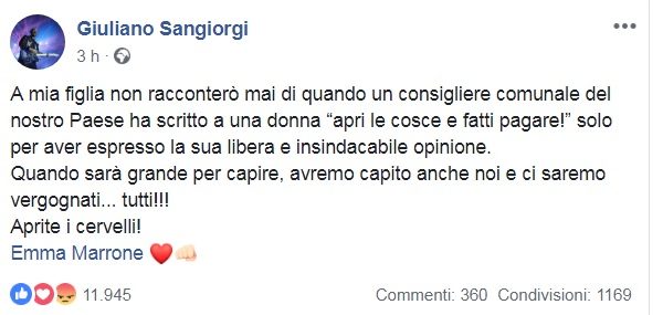 Nel frattempo è pioggia di solidarietà per la cantante salentina e tra i commenti spicca quello di Giuliano Sangiorgi: “A mia figlia non racconterò mai di quando un consigliere comunale del nostro Paese ha scritto a una donna “apri le cosce e fatti pagare!” solo per aver espresso la sua libera e insindacabile opinione. Quando sarà grande per capire, avremo capito anche noi e ci saremo vergognati… tutti!!!