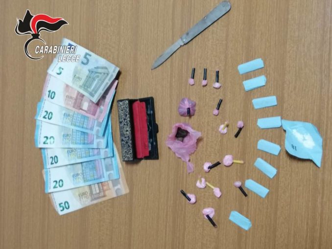 A Ruffano è scattato un arresto in flagranza per Davide Sabato, 20 anni di Matino. All’alba il ragazzo è stato fermato a bordo di una Punto e trovato con tre grammi di ketamina, quattro di cocaina, otto grammi di haschish, un coltellino a scatto con la lama di 5 cm e 145 euro in banconote vario taglio. Entrambi sono ai domiciliari.