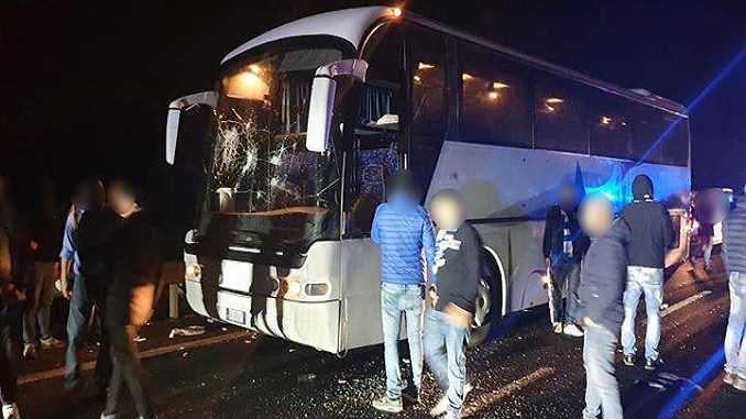 Nel punto in cui il pullman è stato bloccato, un automobilista, che si era fermato per guardare ciò che stava accadendo, è stato investito da un’altra autovettura che era intenta a fare retromarcia. L’uomo ha riportato una ferita alla testa, la prognosi è di 15 giorni. Sono in corso le indagini, da parte della Digos, finalizzate a individuare gli autori dell’agguato, anche con l’ausilio di immagini di videosorveglianza e delle riprese effettuate dal personale della Polizia Scientifica.