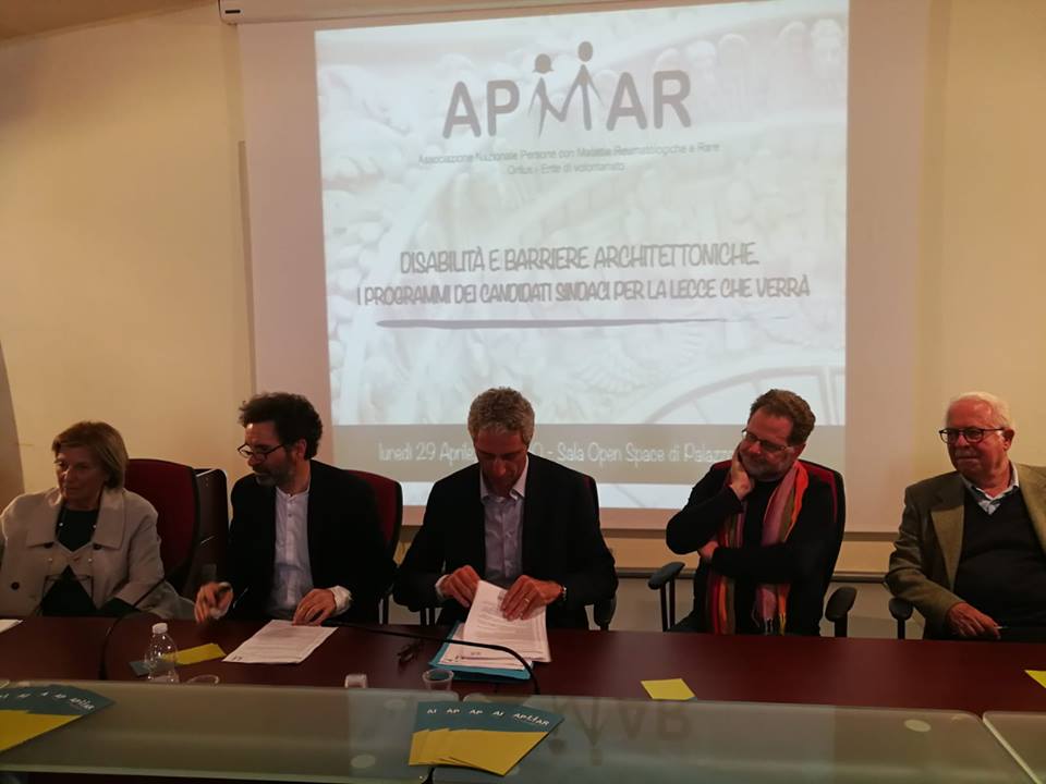 LECCE- Hanno sottoscritto tutti un impegno preciso, quello di rendere Lecce città accessibile alle altre abilità. Un tema cruciale, urgente, complesso quello posto all’attenzione dei sei candidati sindaco da APMAR ONLUS, l’Associazione Nazionale Persone con Malattie Reumatologiche e Rare.