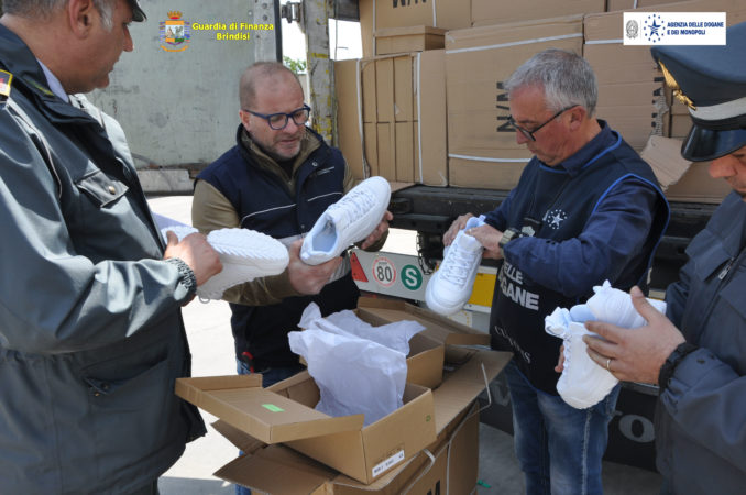 BRINDISI- Nuovi controlli e nuovo sequestro al Porto di Brindisi. I militari della Guardia di Finanza, unitamente a funzionari dell’Agenzia delle Dogane, hanno sottoposto ad accurato controllo un autoarticolato sbarcato da una motonave proveniente dalla Grecia e carico di prodotti “Made in China”. All’interno del mezzo, sono stati rinvenuti 495 cartoni contenenti 11.880 scarpe da ginnastica contraffatte recanti il marchio “FILA”. All’esito delle attività, la merce – il cui valore commerciale è stimato di oltre 300 mila euro – è stata sottoposta a sequestro penale.  I responsabili sono stati deferiti, in stato di libertà, alla competente Procura della Repubblica per il reato di “introduzione nello Stato e commercio di prodotti con segni falsi”.