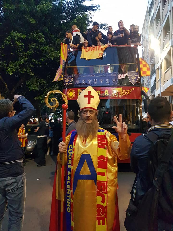 Ad accompagnare a passo d’uomo la sfilata della squadra c’è Pasquale Zonno dei Party Zoo Salento vestito da Sant’Oronzo.